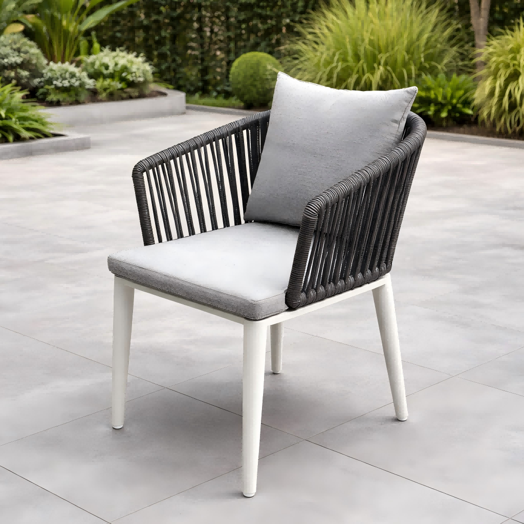 تتميز كراسي تناول الطعام بمسند ظهر منسوج بالحبال، مما يخلق مظهرًا عصريًا وأنيقًا مع توفير دعم مريح. الإطار مصنوع من الألومنيوم المطلي بالمسحوق، والذي يوفر مقاومة ممتازة للصدأ والظروف الجوية الخارجية.