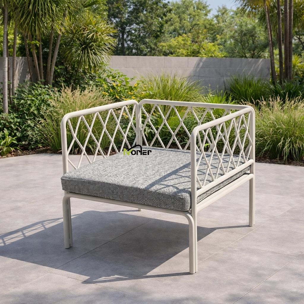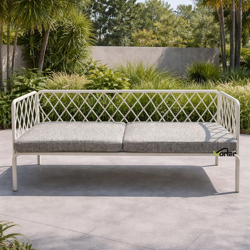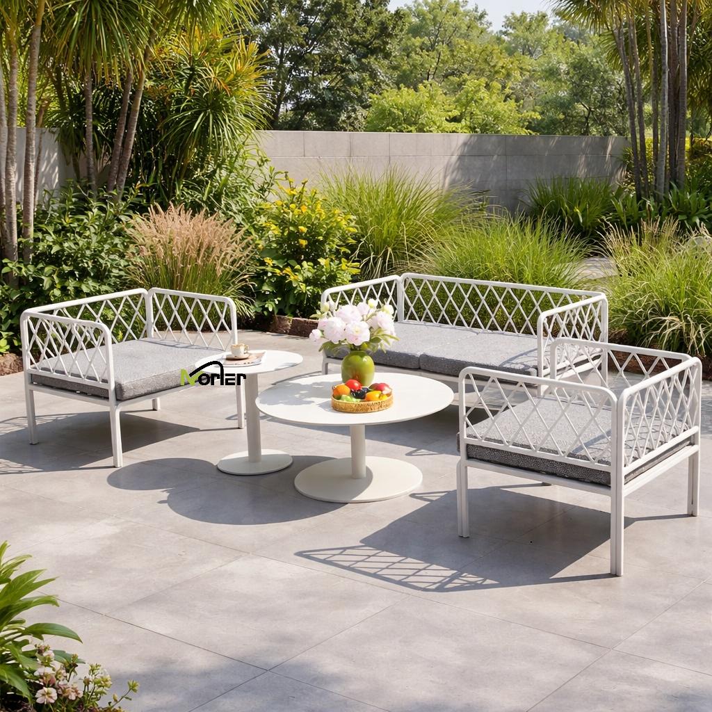 تتميز مجموعة الأرائك الخارجية الحديثة هذه بتصميم نظيف وبسيط مع إطار معدني هندسي مصنوع بشكل جميل. يخلق الهيكل الشبكي المفتوح مظهرًا خفيفًا وأنيقًا مع الحفاظ على الدعم الهيكلي القوي.